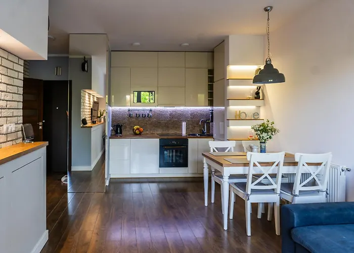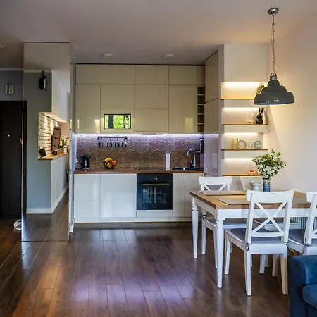 Eine voll ausgestattete Küchenzeile ist ebenso vorhanden wie ein Herd und ein Geschirrspüler. Das Apartment Rodzinny Relaks Z Ogrodem I Garazem ist in unmittelbarer Nähe von der nächstgelegenen Bushaltestelle Coopera-Przychodnia 51. Außerdem gibt es im Apartment Rodzinny Relaks Z Ogrodem I Garazem eine Terrasse mit Blick auf den Garten.